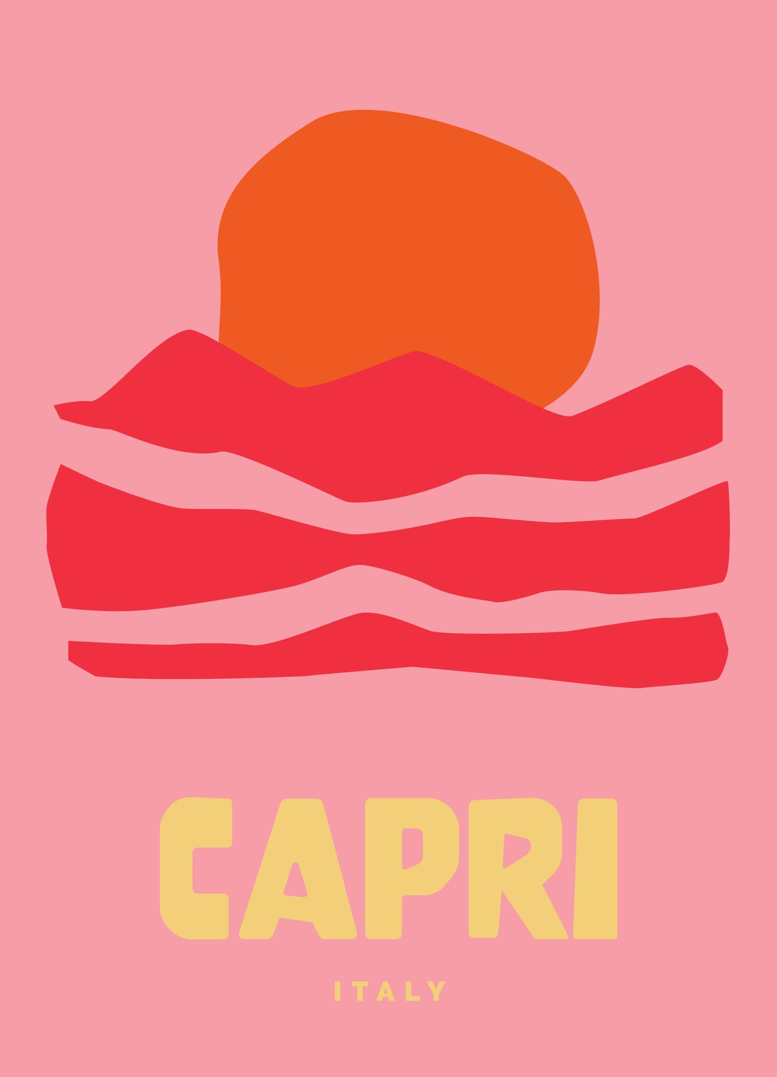 Grafisk kunstplakat i lyserosa, gul, rød og oransje nyanser. Legg til noen lekne farger på veggen din med denne Capri kunstplakaten! Heng opp alene eller som en del av en bildevegg.
