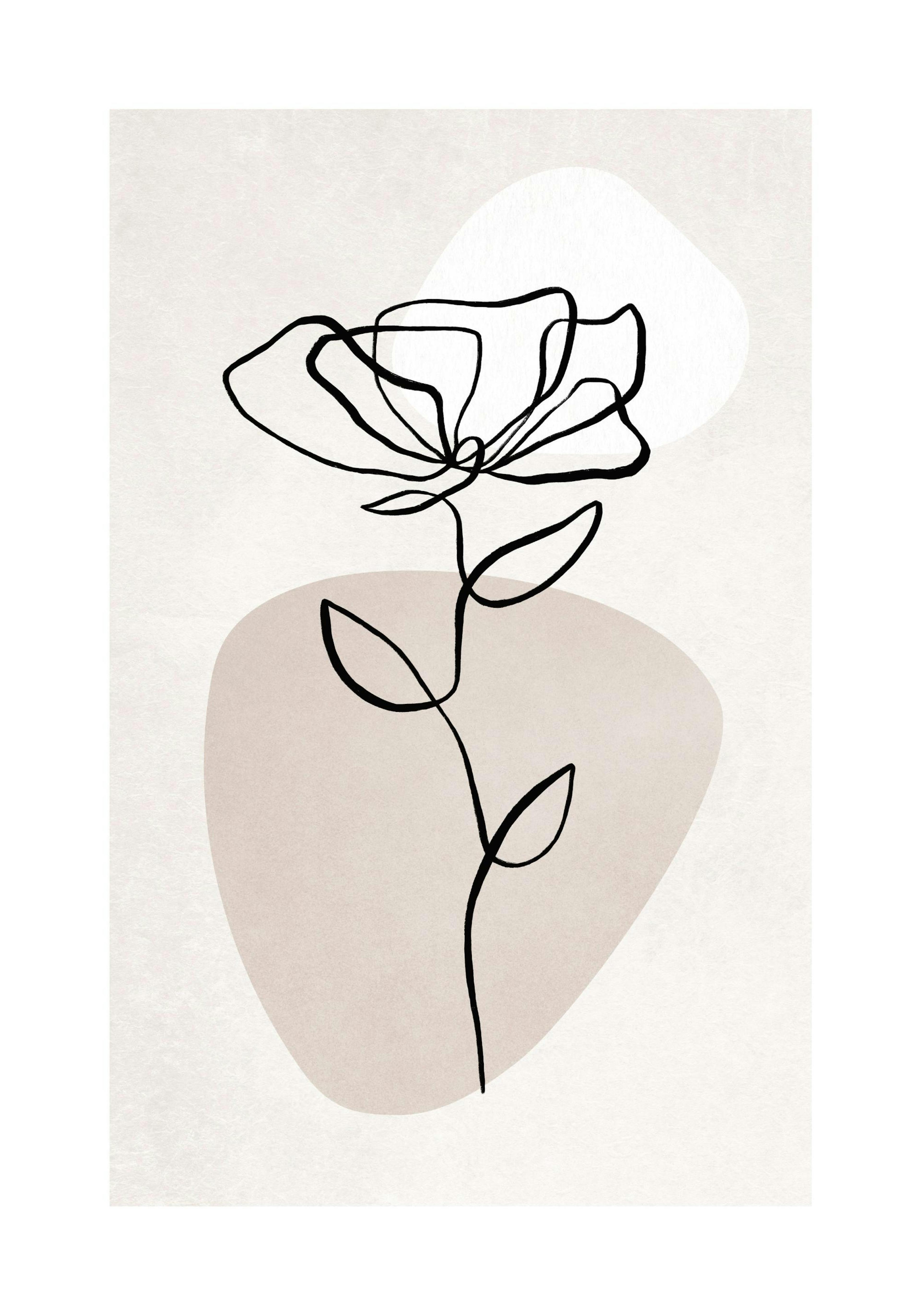 Line art-illustrasjon av en svart blomst mot en lysegrå bakgrunn med en beige og hvit form. Med myke, nøytrale farger og enkel line art skaper du enkelt en minimalistisk stil! Denne plakaten passer også perfekt sammen med Botanical Lines No2.