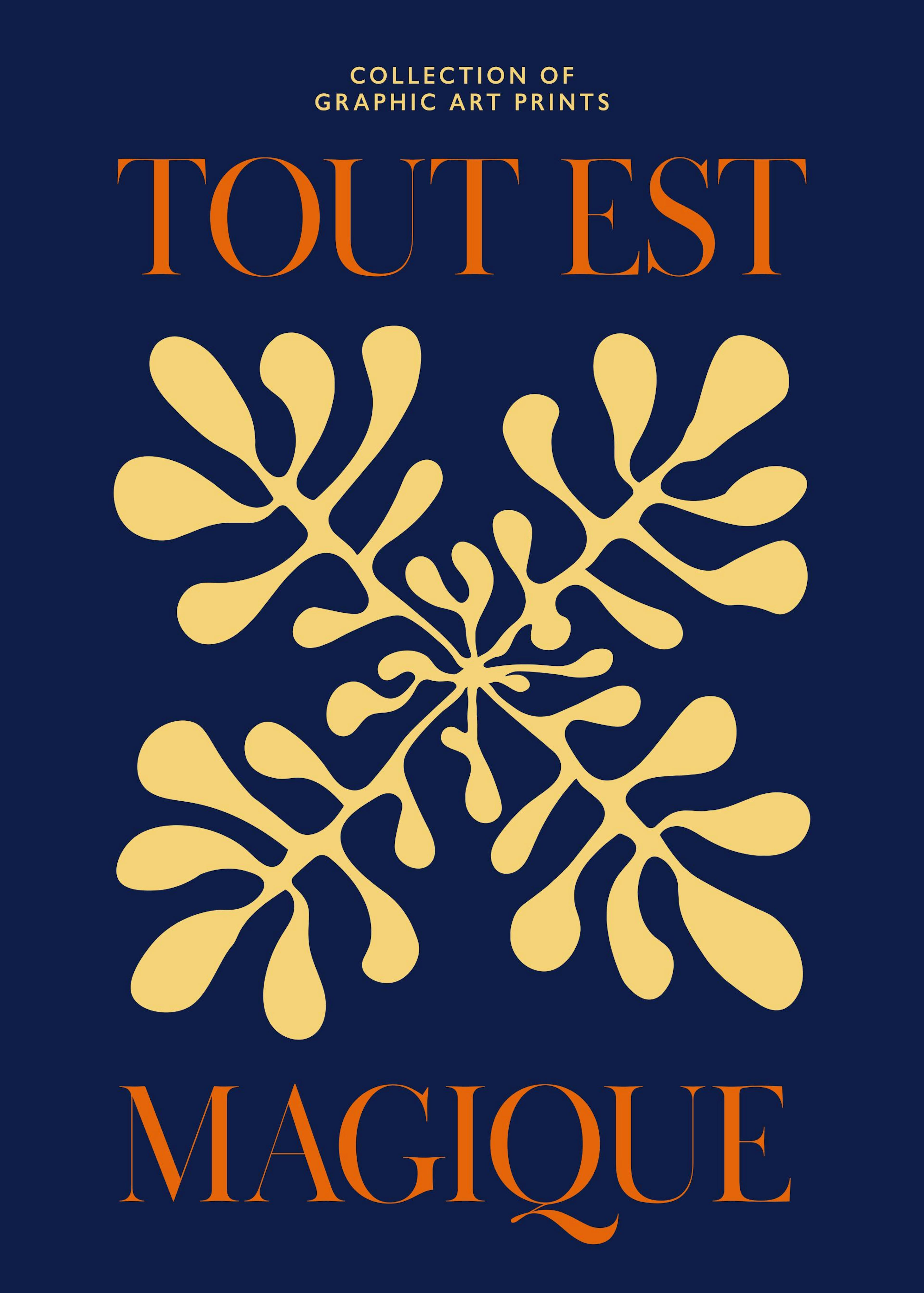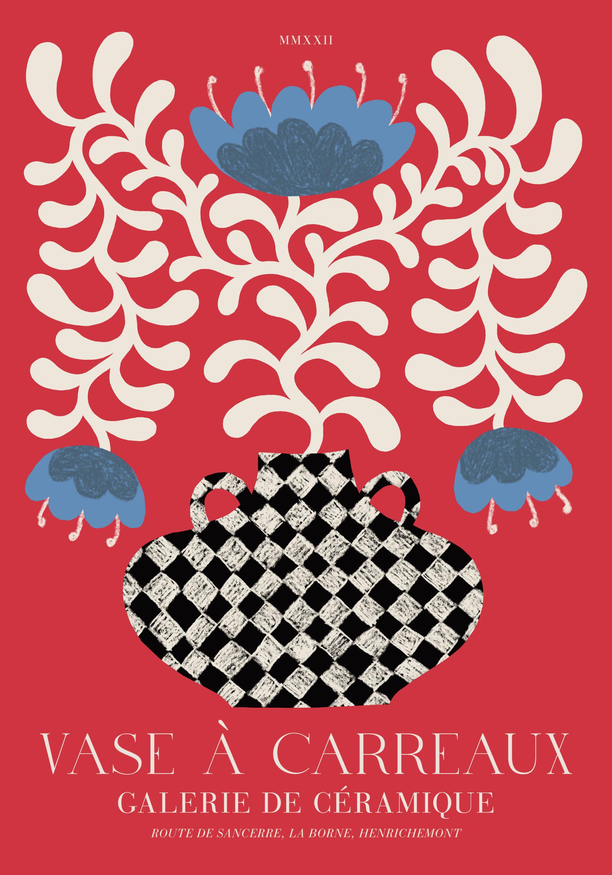 Plakat av en firkantet mønstret vase med en hvit og blå plante og en rød bakgrunn. Plakaten har tekst under og over skrevet i hvitt. Fargerik plakat med et kunstnerisk motiv.