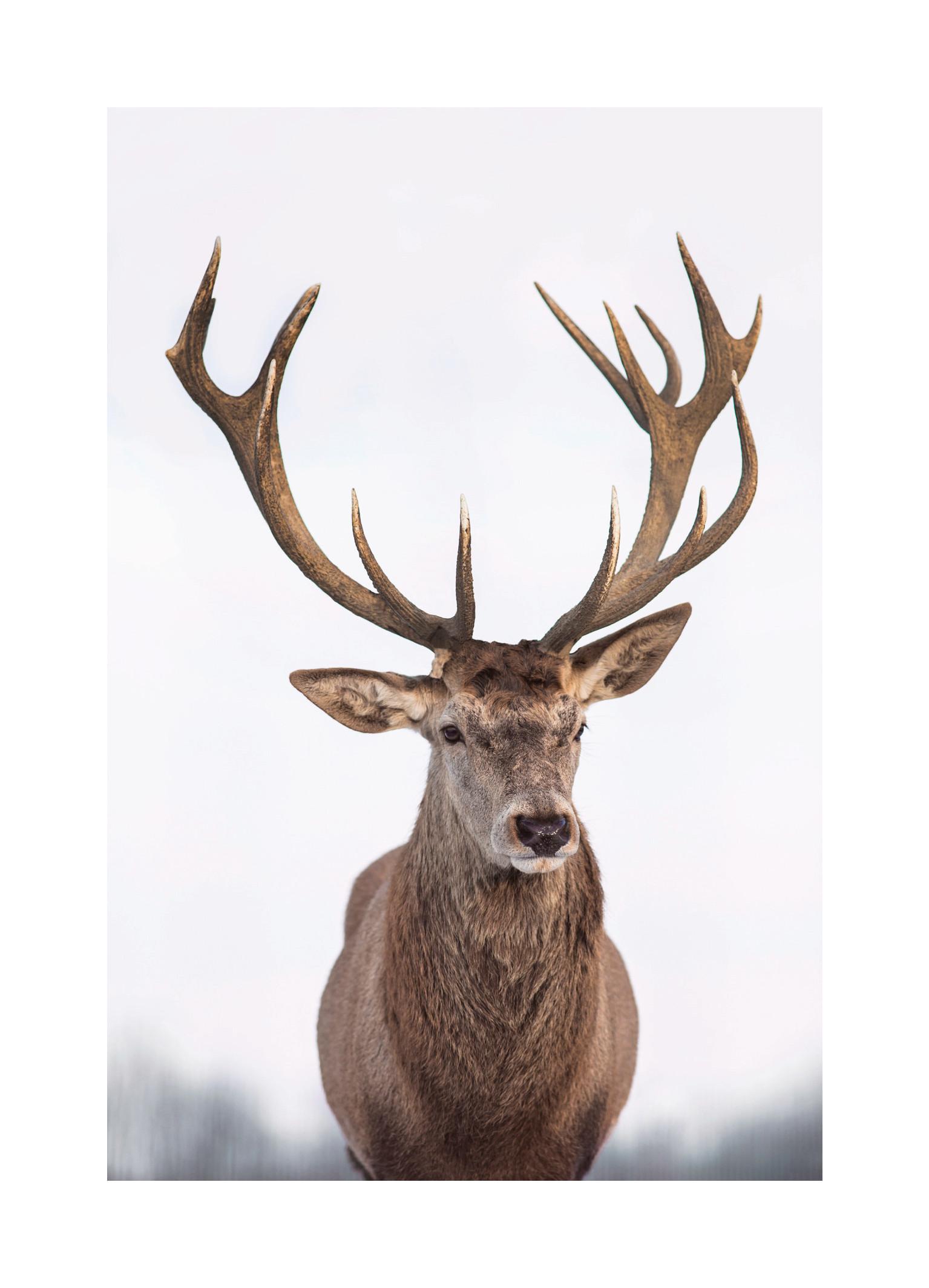 Fotografi av en hjort med stort gevir mot en lys bakgrunn. Kom i julestemning med plakater fra Holiday-kolleksjonen vår! Her finner du vintermotiver og all julestemningen du trenger, perfekt for deg som elsker vinteren.